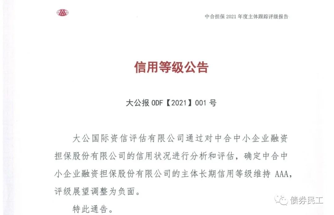 根據(jù)大公國(guó)際2021年6月21日披露的跟蹤評(píng)級(jí)報(bào)告,中合中小企業(yè)融資擔(dān)保股份有限公司(以下簡(jiǎn)稱(chēng)“中合擔(dān)保”)的主體信用評(píng)級(jí)維持AAA,評(píng)級(jí)展望為負(fù)面!