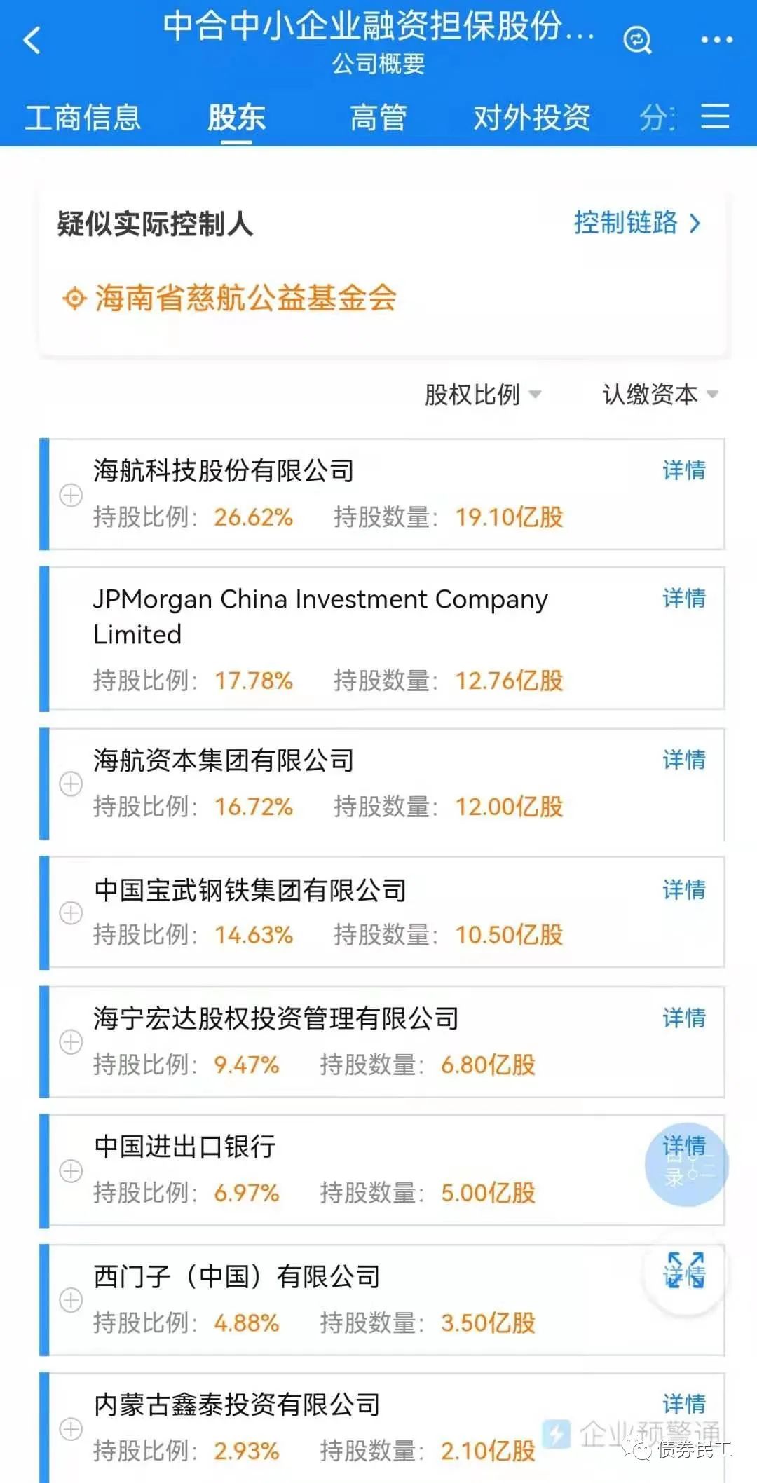 中合擔(dān)保成立于2012年,股東海航科技股份有限公司、海航資本集團(tuán)有限公司、中國(guó)寶武鋼鐵集團(tuán)有限公司和中國(guó)進(jìn)出口銀行等。