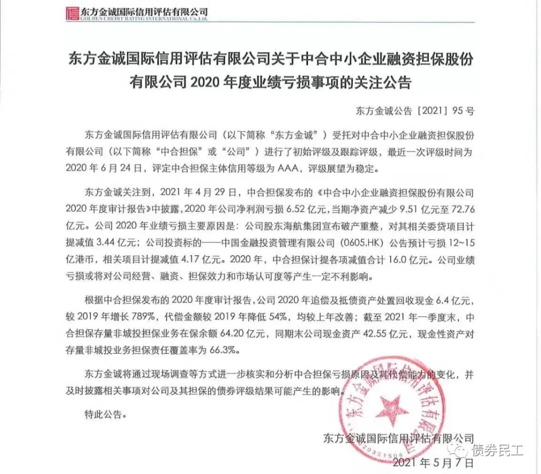 在此之前,中合擔(dān)保發(fā)行過(guò)15中合01和16中合01兩只公司債券,并獲得了大公國(guó)際和東方金誠(chéng)的AAA主體信用評(píng)級(jí)。2021年5月7日,東方金誠(chéng)國(guó)際信用評(píng)估有限公司出具了關(guān)注中合擔(dān)保2020年度業(yè)績(jī)虧損事項(xiàng)的關(guān)注公告,中合擔(dān)保2020年度凈利潤(rùn)虧損6.52億元。目前東方金誠(chéng)尚未出具對(duì)中合擔(dān)保的跟蹤信用評(píng)級(jí)報(bào)告。