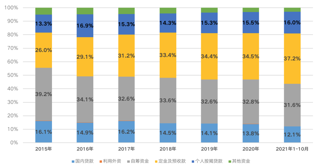 從國家統計局公布的數據來看,前10月,房地產開發企業到位資金16.7萬億元,同比增長8.8%。其中,國內貸款同比下降10%至2萬億,占比跌至12.1%;自籌資金同比增長5.1%至5.3萬億,占比跌至31.6%。此外,定金及預售款同比增長21%至6.2萬億,個人按揭貸款2.7萬億,同比增長9.7%,占比分別提升至37.2%和16%。