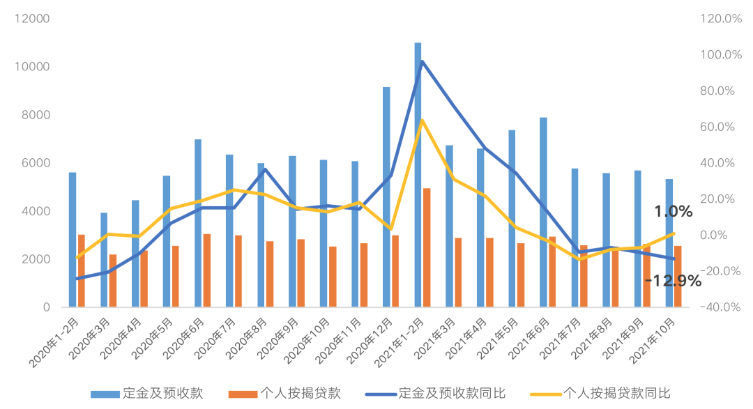 2021年下半年以來,全國房地產市場持續降溫,企業銷售回款同樣陷入增長困境,房企資金周轉壓力不斷加劇。2021年10月,定金及預收款新增5351億元,同比下降12.9%,個人按揭貸款新增2554億元,同比增長1%,相較于上半年兩位數以上的高增長態勢可謂一落千丈。
