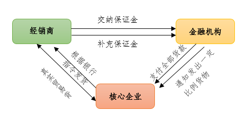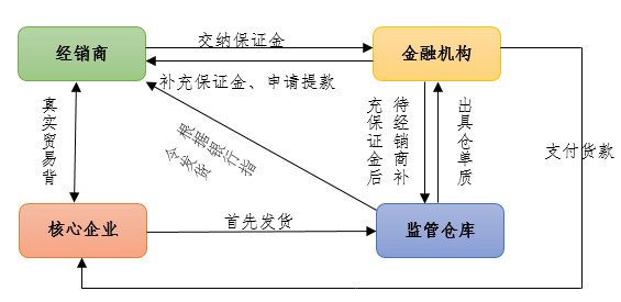 先票(款)后貨模式是貨權質(zhì)押授信業(yè)務的一種,通過存貨質(zhì)押引入核心企業(yè)信用,銀行給經(jīng)銷商融資,預付款給核心企業(yè),核心企業(yè)發(fā)貨給銀行指定的倉儲監(jiān)管企業(yè),貨入庫后立即設定質(zhì)押監(jiān)管,作為銀行授信的擔保,倉儲監(jiān)管企業(yè)根據(jù)銀行的出庫指令逐步放貨給經(jīng)銷商。