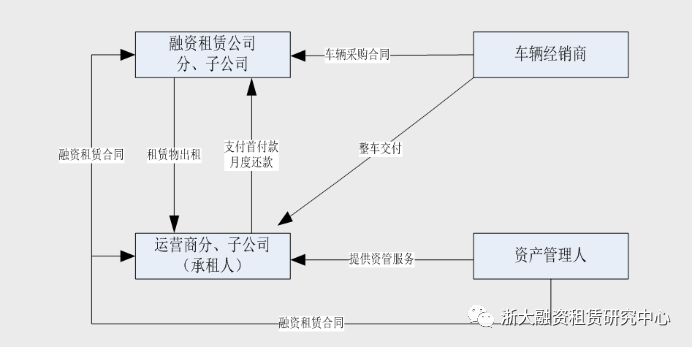 這一模式采用了直租,由融資租賃公司作為出租人向經(jīng)銷商采購車輛,車型全部為同一車型,車輛完成登記上牌后,統(tǒng)一交付至承租人日常運(yùn)營,同時(shí)委托平臺(tái)運(yùn)營商作為資產(chǎn)管理人,負(fù)責(zé)對(duì)車輛的日常運(yùn)營情況進(jìn)行監(jiān)控管理。