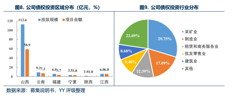 不良資產底層債務人來看,存量非金融項目主要涉及采礦業、制造業和房地產業,其中8個項目的底層債務人為民企;約48%投向了房地產業;區域分布于山西、云南和寧夏地區,云南地區占比60%。