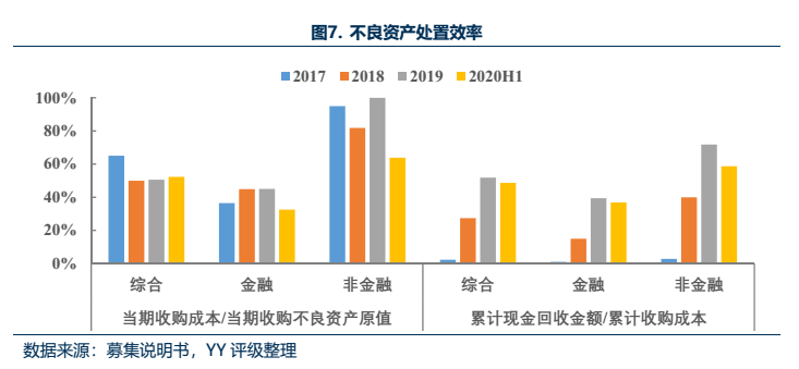 處置效率上,公司來自金融機構不良債權資產的當期收購折扣率約4折,非金融企業債權折扣率8折左右,部分收購為原值收購。截至2020年6月末,公司非金融不良債權累計收購折扣率為81.25%,累計現金回收率58.66%,收購成本較高;來自金融機構不良債權的收購成本不高,處置進度一般,整體收購成本偏高,不排除輸血嫌疑。