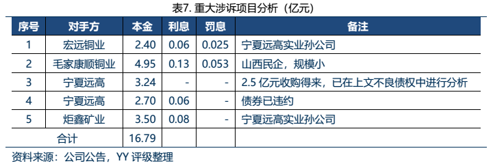 具體來看,項目1、3、4、5均與寧夏遠高實業有關。2020年11月23日,寧夏遠高的“18遠高01”發生實質性違約,此前寧夏遠高已申請破產重整。在這一背景下,公司贏得訴訟之后,也將面臨著回款周期長、與多個金融機構共同追債等困難情況,執行難度大??紤]到均有抵質押物等增信,保守估計清償率按30%的情況下,這5個重大涉訴項目將導致約11億元的損失。