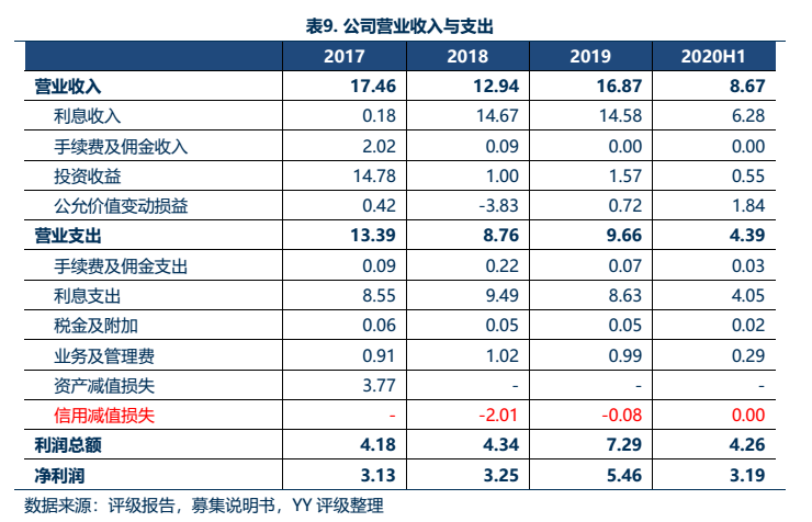 從成本端來看,公司主要成本項包括利息支出、資產減值損失/信用減值損失及少量業務及管理費,其中利息支出均為融資支付的利息,占營業支出的比例約90%。