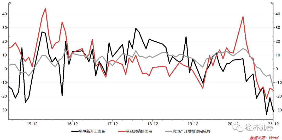 去年下半年以來,商品房銷售面積和新開工面積當(dāng)月同比增速從6月底的7.5%和-3.8%,大幅下降至12月份的-15.6%和-31.5%,房地產(chǎn)行業(yè)幾乎“一夜入冬”(圖1)。房地產(chǎn)下滑有周期性原因,也有結(jié)構(gòu)性原因。2015-2020年,房地產(chǎn)行業(yè)呈現(xiàn)復(fù)蘇和分化走勢,但整體處于高位,行業(yè)自身存在調(diào)整性需求。同時,房地產(chǎn)稅試點(diǎn)預(yù)期,房地產(chǎn)頭部民營地產(chǎn)企業(yè)排隊(duì)“棄療”,在供需兩端抑制了房地產(chǎn)市場活動。巨大下行慣性下,扭轉(zhuǎn)需要更大力度、更加協(xié)調(diào)的政策刺激。