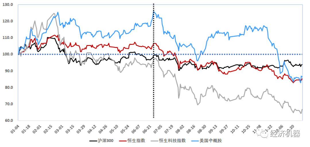 圖7、滬深300,恒生指數(shù)、恒生科技和中概股指數(shù)2022年表現(xiàn)
