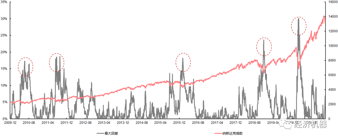 圖8、2009年以來,納斯達(dá)克指數(shù)回撤與走勢