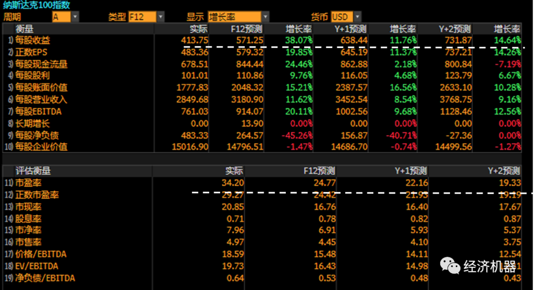 圖13、納斯達(dá)克100指數(shù)未來幾年盈利增速及估值:一致預(yù)期