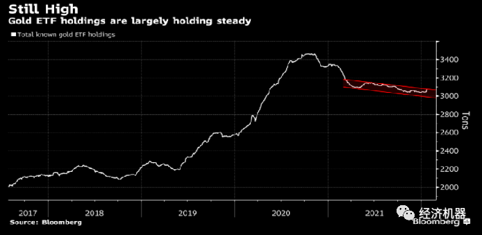 2021年COMEX黃金在美元加息預(yù)期下,全年下跌7.54%,幅度并不大。主要原因在于即便有加息預(yù)期,但美國國債收益率年內(nèi)并未有大幅表現(xiàn)(圖15),而同期通貨膨脹率上升,12月CPI名義增速已經(jīng)高達(dá)7%,美債實(shí)際利率持續(xù)處于深度負(fù)值區(qū)間。從黃金ETF持倉量來看(圖16),市場始終預(yù)判美聯(lián)儲難以將政策收緊到利率高于通脹的水平,持倉量并未大幅回落。