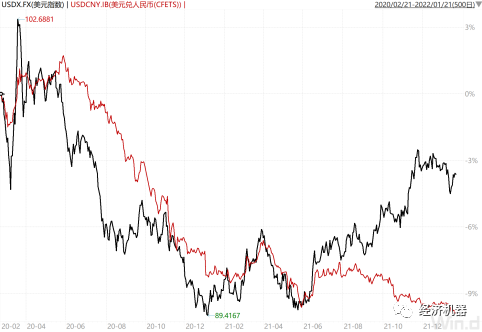 2021年,美國縮表和中國出口強(qiáng)勁下,出現(xiàn)了美元和人民幣雙雙升值的罕見現(xiàn)象(圖14),都能從基本面和政策面上找到原因。