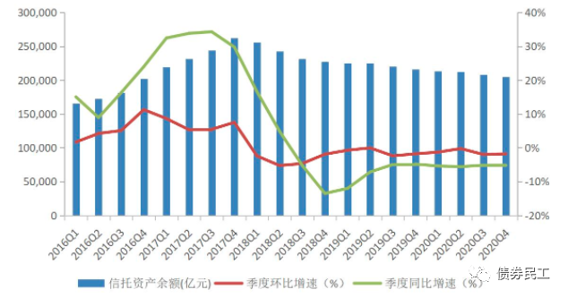 從信托資產(chǎn)規(guī)模數(shù)據(jù)來看,截至2020年底,信托資產(chǎn)規(guī)模為20.49萬億元,同比2019年下降5.17%,較2017年底信托資產(chǎn)最高峰的26.25萬億元下降了5.76萬億,下降了21.94%!(數(shù)據(jù)來自于中國信托業(yè)協(xié)會公布的數(shù)據(jù))