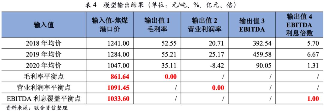 根據測算,若將2018-2020年焦煤港口價[3]輸入模型,2018年及2019年焦煤樣本企業營業利潤率指標均表現良好,2020年營業利潤率指標表現較差。當焦煤港口價達到861.64元/噸時,則達到焦煤樣本企業毛利率的平衡點。當焦煤港口價達到1033.60元/噸時,焦煤樣本企業的EBITDA剛好可覆蓋相關的利息支出。當焦煤港口價為1091.45元/噸時,達到焦煤樣本企業營業利潤率的平衡點。