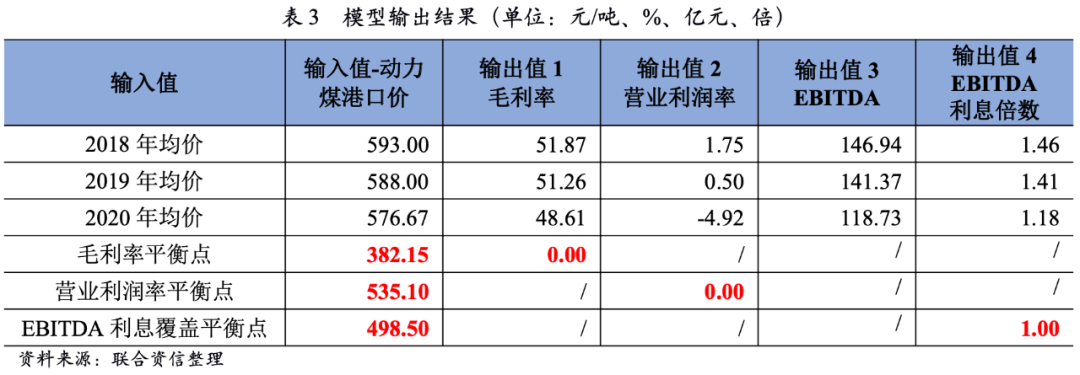 根據測算,若將2018-2020年秦皇島港口動力煤市場價全年均值輸入模型,毛利率指標、EBITDA及EBITDA利息指標均表現良好。若動力煤港口價下降至382.15元/噸,則達到動力煤樣本企業毛利率的平衡點,即動力煤樣本企業毛利率為0。當動力煤港口價達到498.50元/噸時,動力煤樣本企業的EBITDA剛好可覆蓋相關的利息支出。當動力煤港口價為535.10元/噸時,達到動力煤樣本企業營業利潤率的平衡點,即樣本企業的營業利潤率為0。