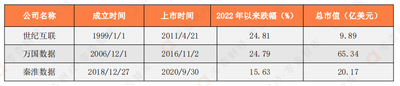 (一)萬國數據市值最高,秦淮數據市值已超世紀互聯