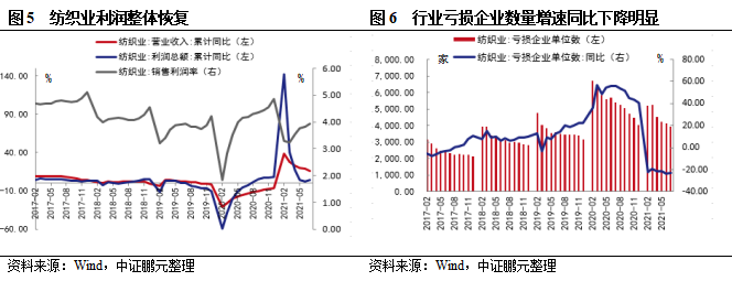 2021年上半年紡織行業經營情況逐步好轉,營收穩步增長,利潤整體恢復。2021年1-6月,紡織行業實現營業收入11,707.50億元,同比增長18.90%;實現利潤總額446.00億元,同比增長2.30%,利潤整體恢復;銷售利潤率為3.81%,逐步恢復到疫情前水平。2021年6月末紡織業企業18,407家,上半年虧損企業4,130家,同比減少23.8%,虧損金額88.3億元,同比減少21.7%。虧損面22.4%,較上年同期下降7.8個百分點。根據中國紡織工業聯合會調查數據,2021年上半年紡織行業景氣指數為65.4,連續5個季度位于50榮枯線以上,為2012年以來的最高水平。