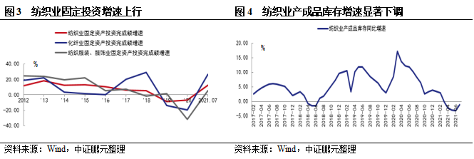 在國內外市場需求復蘇支撐下,行業投資恢復,產能利用率穩步向好,存貨規模有所下降,行業景氣度提升。2021年上半年紡織業固定投資呈現增長,1-7月同比增長12.30%,恢復較為明顯。根據國家統計局數據,2021年上半年,紡織業產能利用率為79.7%,高于同期全國工業77.9%的水平,較2020年同期提高9.4個百分點。存貨方面,部分訂單向國內轉移,同時國內需求增長超預期,今年以來國內紡織品產成品庫存規模處于近年來低位,截至2021年6月末,紡織業產成品存貨規模1,597億元,同比下降3.2%。