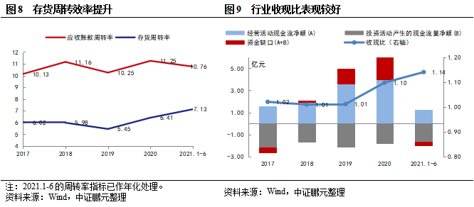 現金流方面,樣本企業整體收現情況仍較好,收現比持續上升;投資方面,2021年上半年樣本企業固定投資增長較多,呈現經營現金流凈額未能完全覆蓋投資流出的情況。