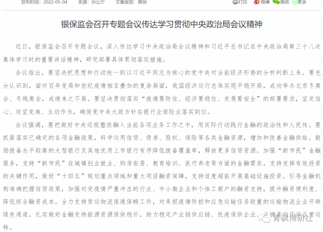 一、5月4日,金融管理部門齊發聲,公布4月29日政治局會議(參見剛剛,429政治局會議釋放了哪些重大信號?)的學習新聞稿,雖然沒有太多增量信息,但穩預期的信號卻比較明顯。之所以選擇在這一天齊刷刷公布新聞稿,理由其實很簡單,主要有兩個:
