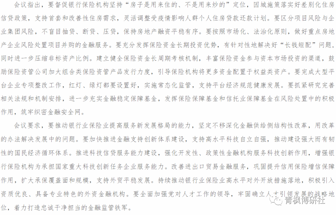 三、銀保監會的學習新聞稿要點主要有(一)鼓勵撥備水平較高的大型銀行及其他優質上市銀行有序降低撥備覆蓋率,釋放更多信貸資源(參見如何理解”降低撥備覆蓋率“這一提法?);(二)服務新市民、做好“十四五”規劃重點領域和重大項目融資保障、幫扶困難行業和企業、支持能源保供和物流行業和企業;(三)進一步壓縮非標資產比例;(四)完成大型平臺企業專項整改工作;(五)進一步充實金融穩定保障基金。