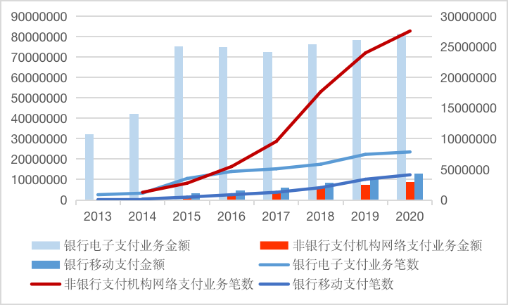 圖:近些年銀行電子支付、移動支付及非銀支付對比(單位:萬筆、億元)