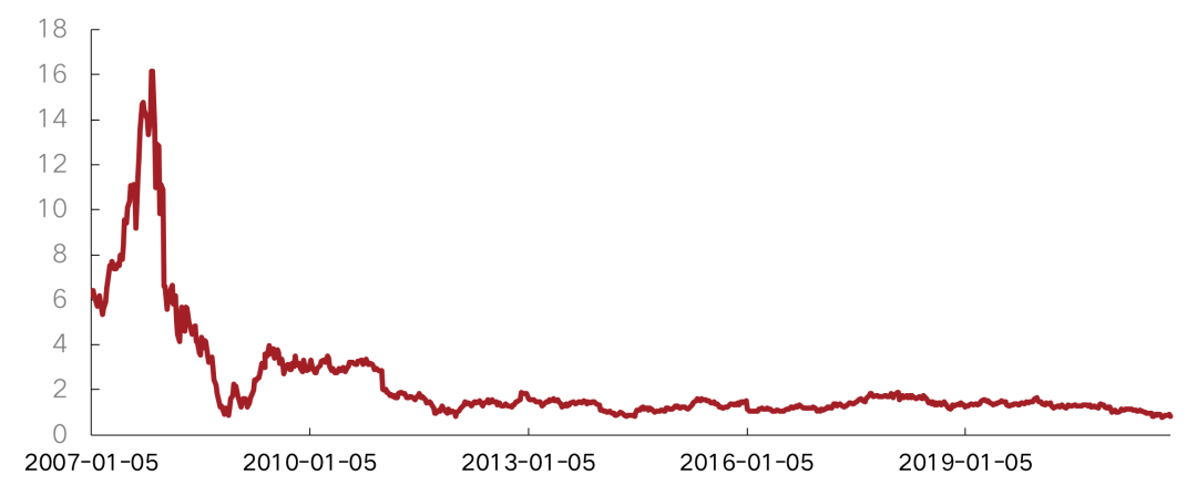 10月,恒生地產建筑業指數的成交額占恒生綜合行業總成交額之比月均值較上月回落。本月周均值8.8%,低于18年至今的歷史均值11.3%,較上月下降1.5個百分點,成交額出現回落。