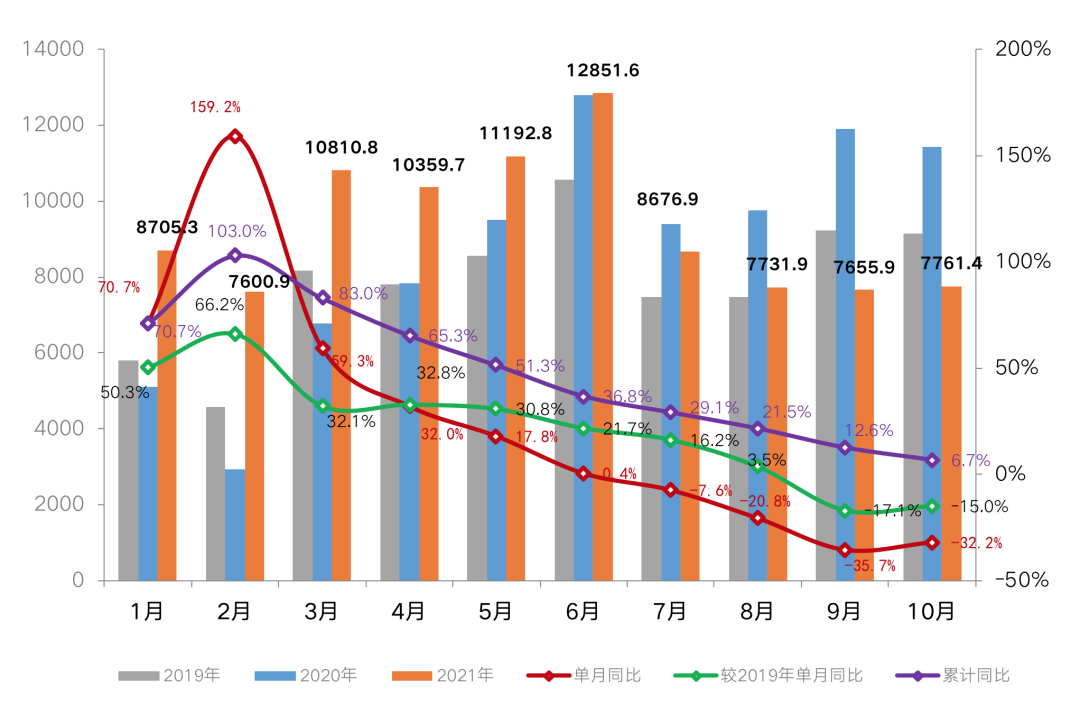 2021年10月,典型城市商品住宅成交熱度延續低位波動,整體市場壓力較大,傳統房地產旺季“金九銀十”失約,百強房企單月業績表現也不樂觀,10月,百強房企實現銷售操盤金額7761.4億元,受下半年市場明顯降溫的影響,10月單月業績同比去年同期延續了自7月以來的下跌趨勢。