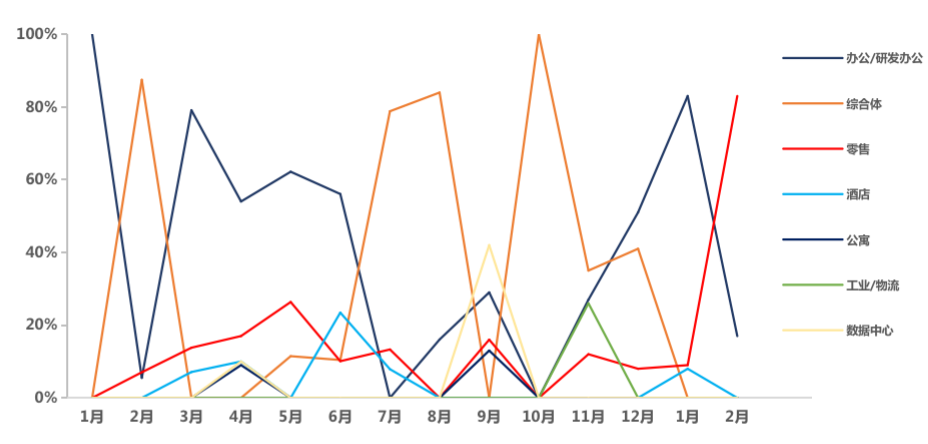 一線城市新興商務(wù)區(qū)的優(yōu)質(zhì)寫(xiě)字樓以及運(yùn)營(yíng)表現(xiàn)優(yōu)異、回報(bào)穩(wěn)定的商業(yè)資產(chǎn)受到資本青睞。1月,辦公/研發(fā)辦公業(yè)態(tài)成交占比超80%,為絕對(duì)主力;2月,受上海商業(yè)成交占比提升影響,一線城市整體商業(yè)占比大幅提升,為近一年來(lái)最高值。