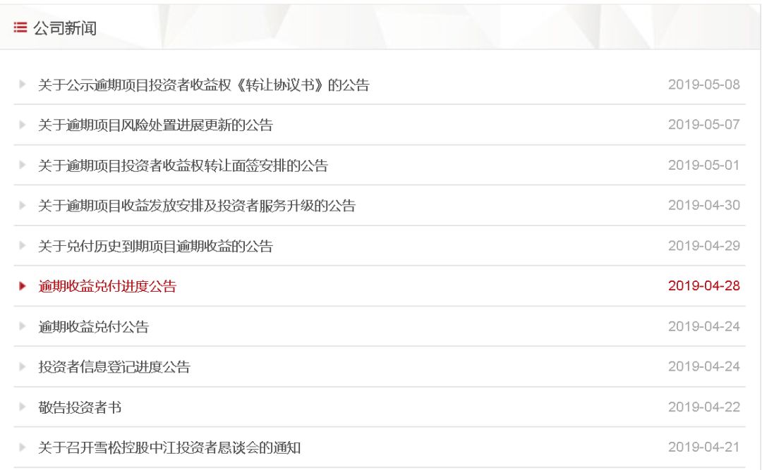 本次轉(zhuǎn)讓的標的為違約項目的利息權(quán)利;轉(zhuǎn)讓后雪松控股將在7月22日之前按原合同約定收益率支付利息給投資者