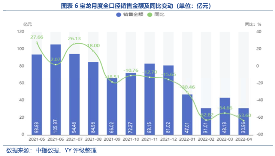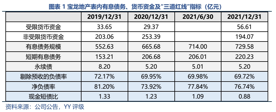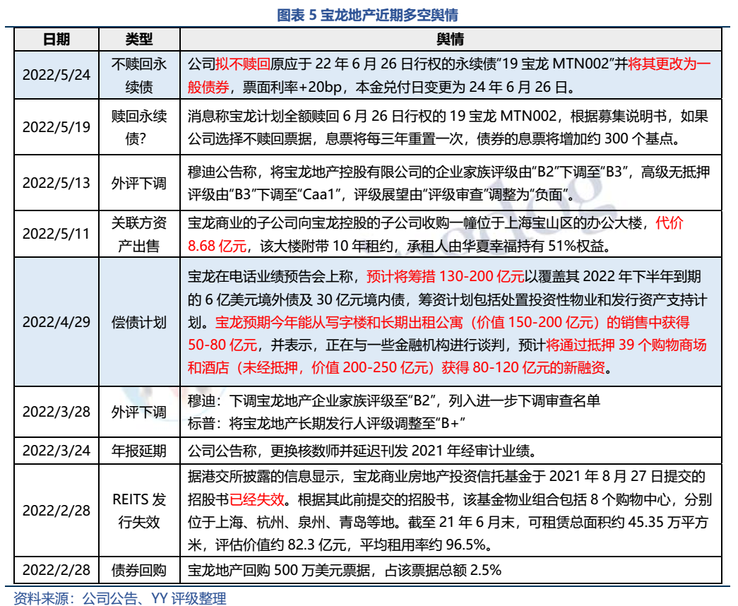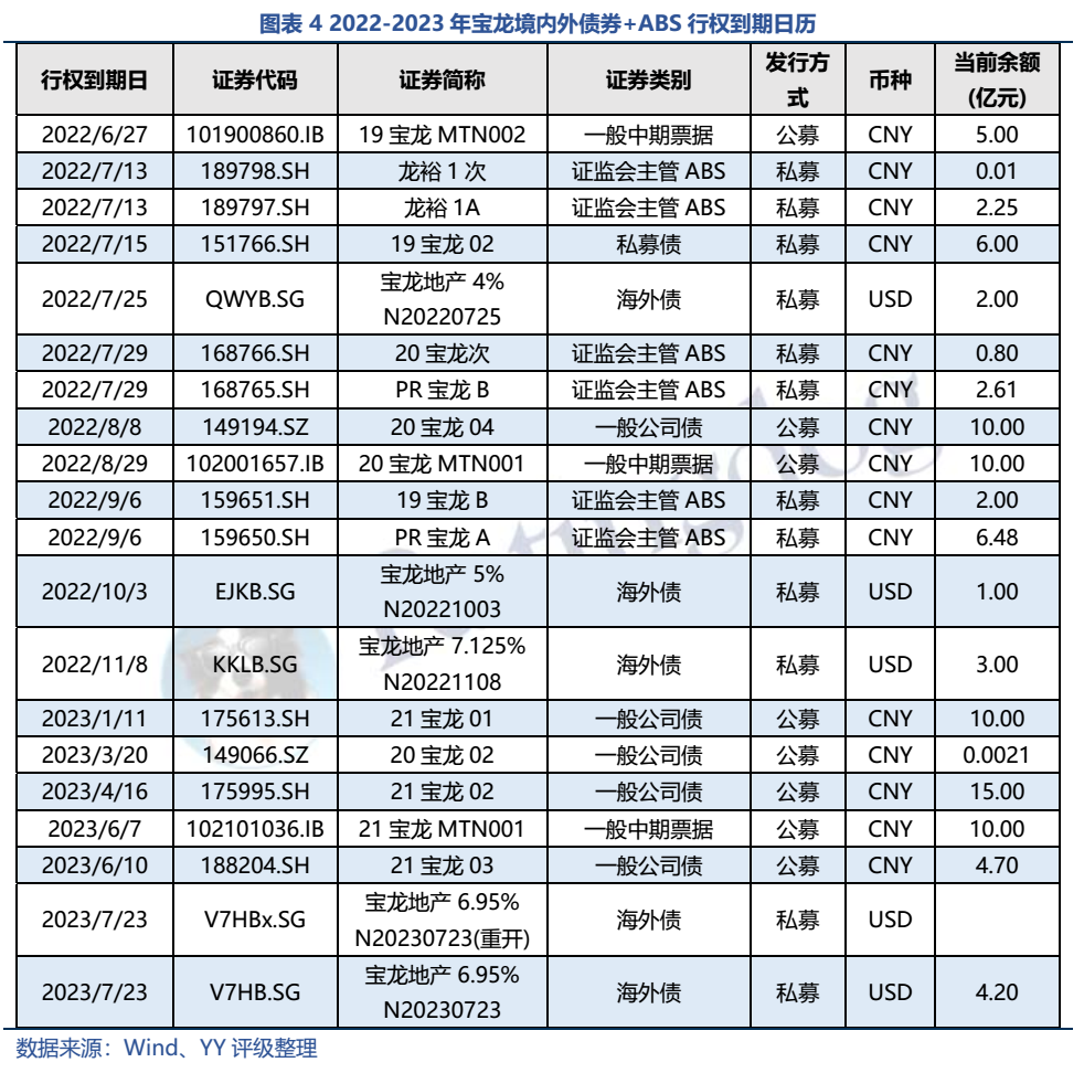 YY去年對寶龍的跟蹤報告曾指出,寶龍在2022年面臨集中到期大考(2022年有80億元人民幣+7億美元+10億港元債券行權或到期)。2022年以來,寶龍如同其他高收益民企,接連遭遇銷售額腰斬、資本市場融資受阻等困境,而年報顯示21年末非受限貨幣資金/短期債務比僅有0.88,出現資金缺口。寶龍于上半年勉力還債后,今年6-12月還有45.15億元境內債(含ABS)+6億美元境外債面臨行權或到期,折合人民幣約85億元。集中兌付壓力下不容喘息。