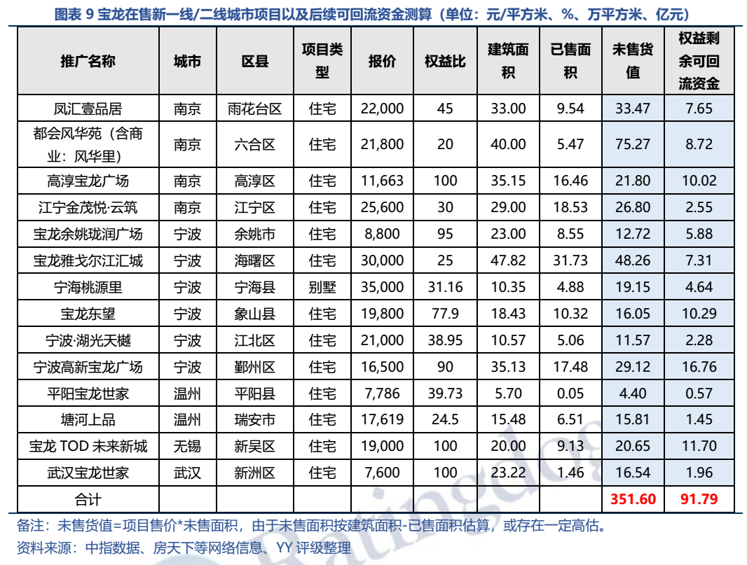 01 寶龍位于新一線/二線城市(長三角的南京、寧波、溫州、無錫,以及中部的武漢)的在售項目,在完全去化的理想情況下,后續可回流資金約**億元,實際可回流資金仍取決于銷售復蘇情況