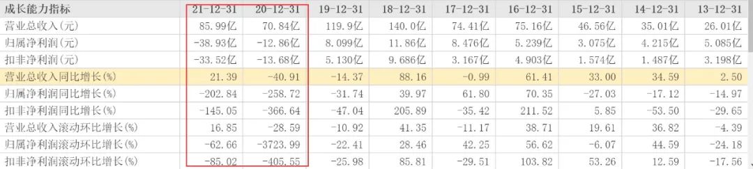 2021年營收略有起色,同比增加21.39%為85.99億元,但遠還沒到恢復元氣的程度。歸屬凈利潤卻繼續滑坡,同比大降了202.84%為-38.93億元。