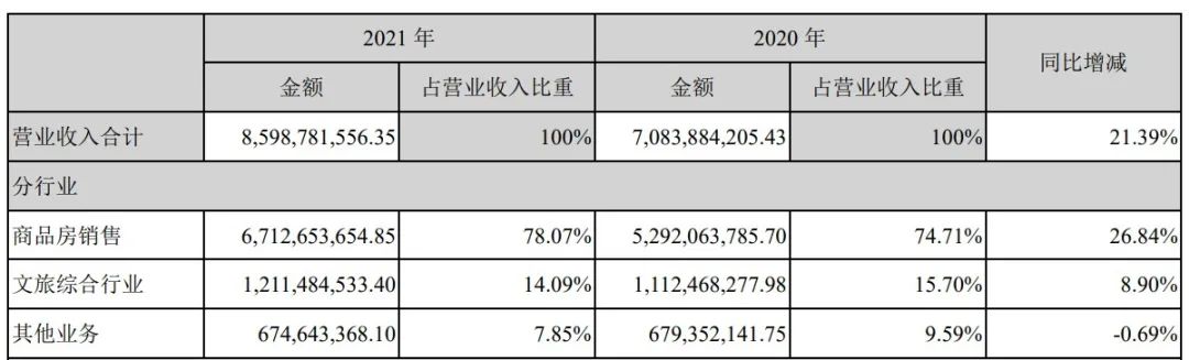 此外杠桿地產發現,盡管改名側重文旅,但新華聯的額核心業務仍為商品房銷售,且2021年商品房銷售占營收比重比2020年還增加了3個多百分點。從營收同比增速來看,商品房銷售也更具優勢。