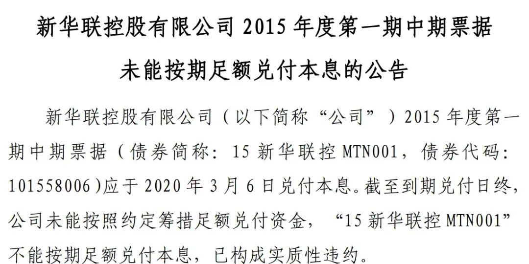 時間拉回到2020年3月6日疫情爆發初期,新華聯就已經官宣債務違約,如下圖,同時該違約觸發了“19新華聯控SCP002”及“19新華聯控SCP003”的交叉保護條款約定情形,這兩筆超短期融資券應償付本息金額分別為10.68億元、3.73億元,繼續違約。