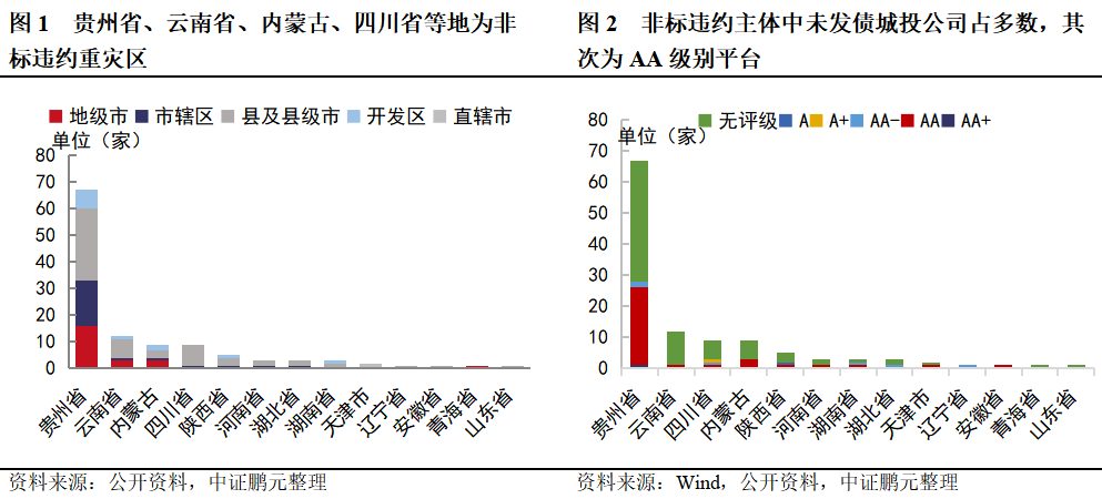 (1)2018年以來,城投非標違約事件頻發,依據公開市場資料,自2018年1月起至2020年11月底,我國城投非標違約事件共發生90次,涉及非標違約主體117家(包括融資方和擔保方)。貴州省、云南省、內蒙古、四川省等地為非標違約重災區,縣級平臺、未發債平臺非標違約比例較高。此外,需關注的是,城投非標違約在行政級別上具有向上蔓延性,一般地級市平臺發生違約時,其所轄區域內下級平臺基本已發生多次違約。