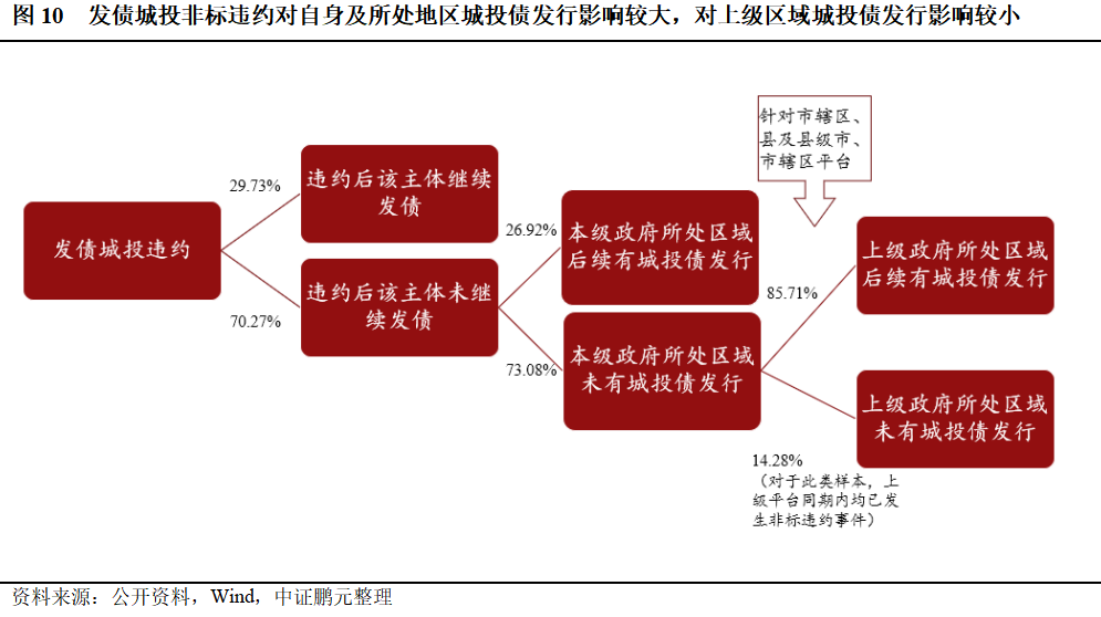 通過對2018年以來非標違約事件梳理,可以得到以下結論:(1)發債城投非標違約后,占比70.27%的發債城投后續未有城投債發行;(2)發債城投非標違約后,占比51.35%的平臺所處區域未有城投債發行;(3)城投非標違約對上級政府所處區域城投債發行影響較小。
