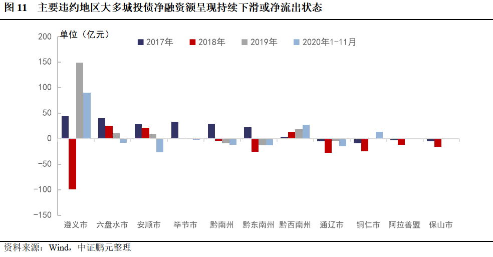 從主要違約地區城投債發行利率來看,2019年起貴州省城投債發行利率與全國平均發行利率之差波動走高,2020年初最高達到262BP,2020年9月以來,隨著貴州省利用茅臺化債的力度加大,市場對貴州城投認可度有所提升,債券發行利率有所回落;2018年以來云南地區城投債發行利率確有明顯抬升,2017-2019年及2020年1-11月,3年期AA級別城投債平均利差分別為2.53、3.96、4.36和3.79,整體有所增長;內蒙古地區城投債發行期限、發行主體級別較分散,發行利率未有明顯趨勢。