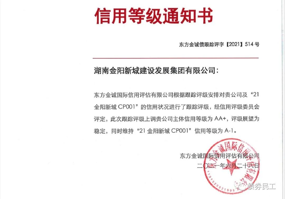 根據東方金誠2021年6月28日出具的跟蹤評級報告,湖南金陽新城建設發展集團有限公司(以下簡稱“湖南新城建發”)的主體信用評級上調至AA+。本次評級上調的原因可能包括:長沙市和瀏陽市經濟實力很強、瀏陽恒康等國有資產劃入、在資產注入和政府補貼方面得到實際控制人的支持等。