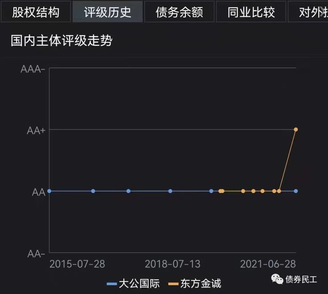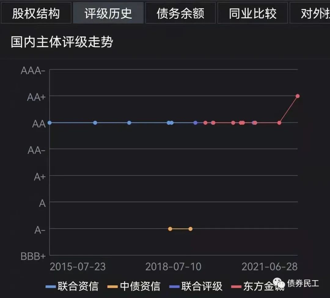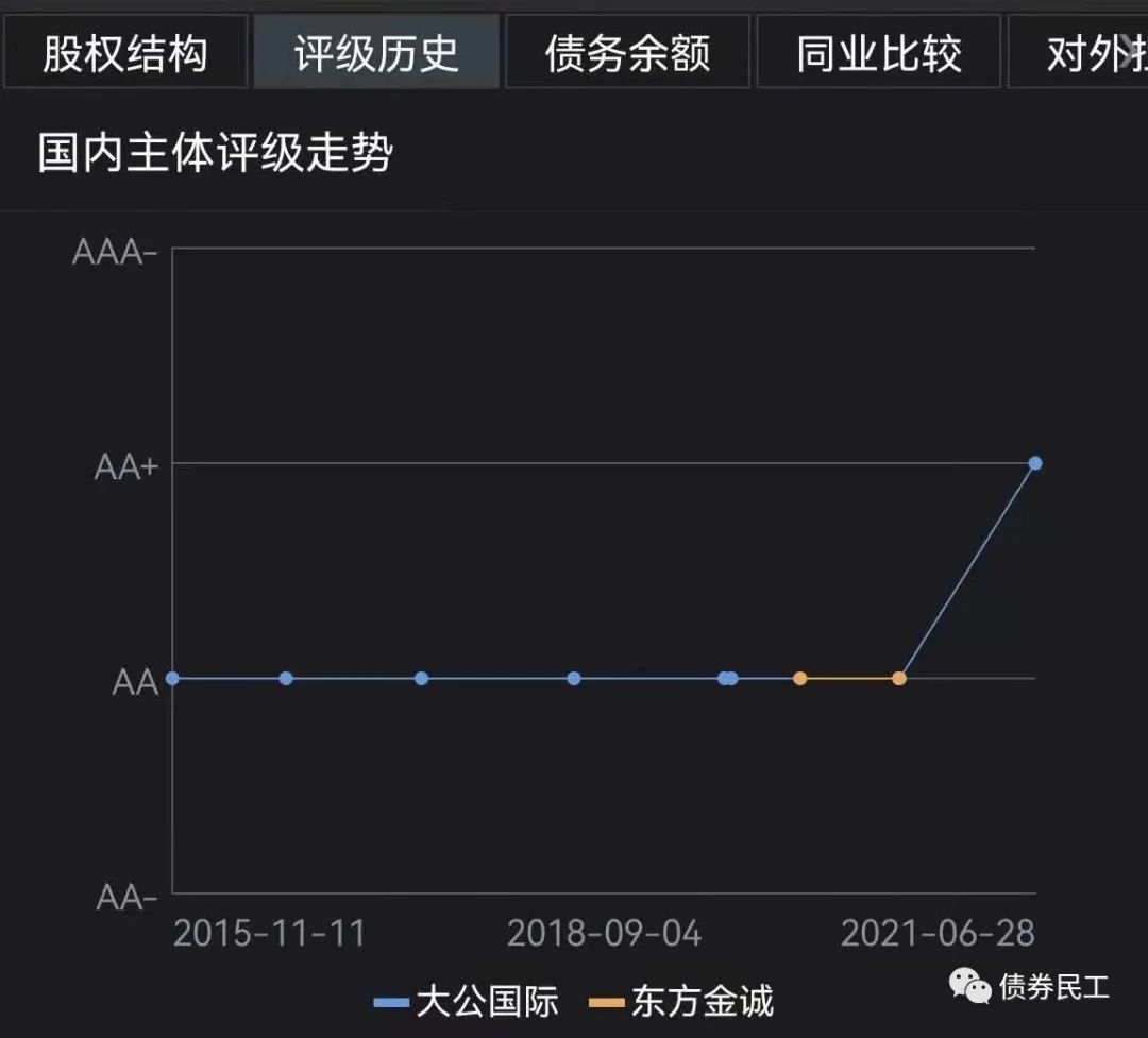 承德國控是承德市重要的公用事業、土地整理及投融資等業務的運營主體,主營業務包括供熱業務、水務業務、土地整理業務、旅游業務和工程建設業務等。根據公開信息查詢,承德國控是承德市唯一的發行過債券的城投公司。承德國控的評級歷史如下圖,評級機構包括東方金誠和大公國際。