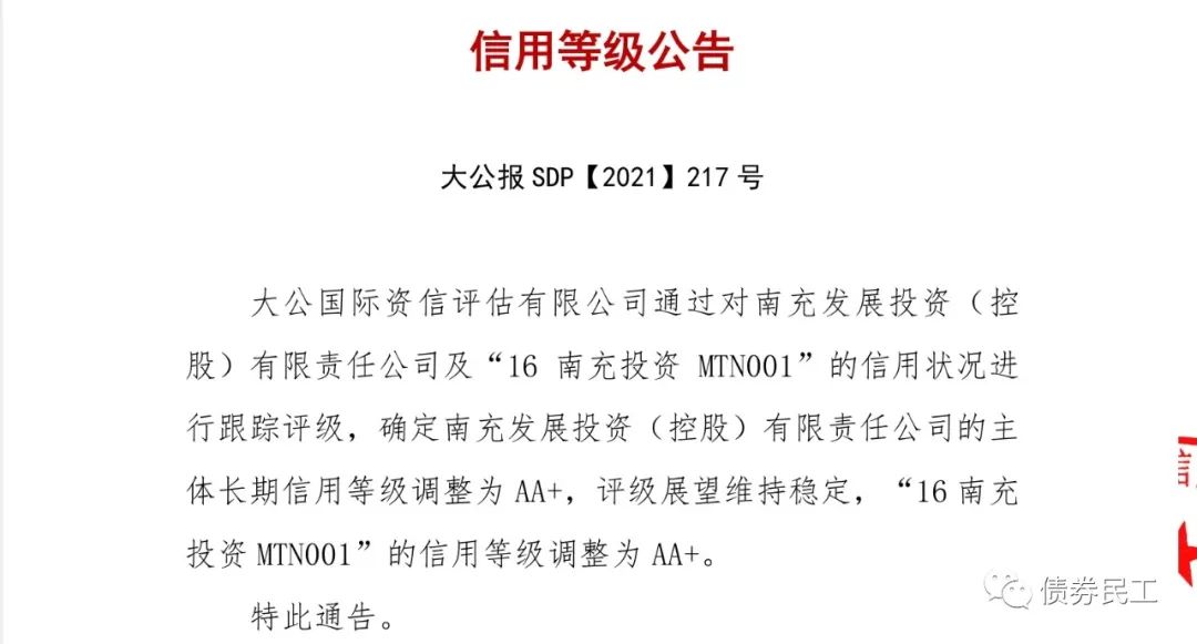 根據大公國際2021年6月29日出具的跟蹤評級報告,南充發展投資(控股)有限責任公司(以下簡稱“南充投資”)的主體信用評級上調至AA+。本次評級上調的原因可能包括:南充市經濟穩定發展、公司的重要地位及獲取政府補助的持續性、工投公司和交投公司股權劃入和主營業務區域專營性較強等。