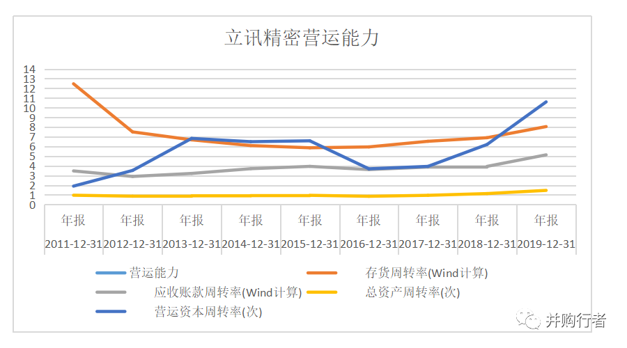 從下圖,我們可以看出經過多年的并購,立訊精密的總資產周轉率、存貨周轉率、營運資本周轉率、營運資本周轉率都呈上升趨勢,在被并購標的資產營運效率相比立訊精密來說要低的情況下,可見并購的整合使得被并購標的的運營效率得到很大的提高,