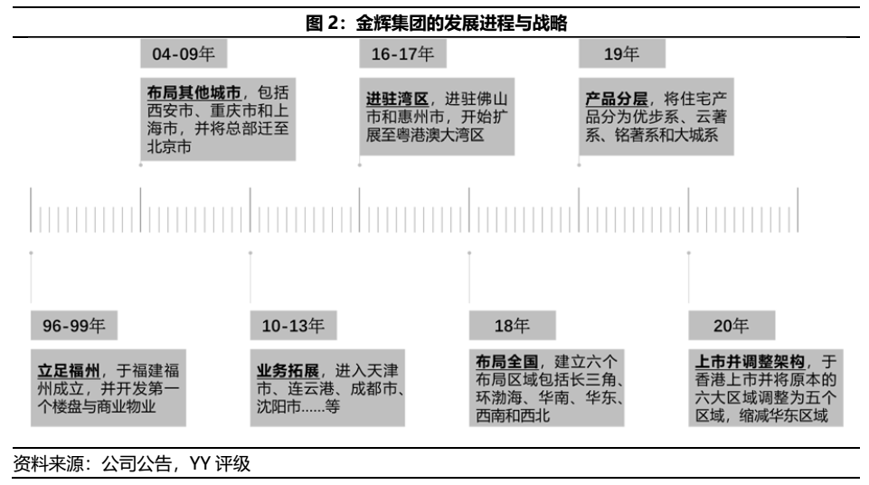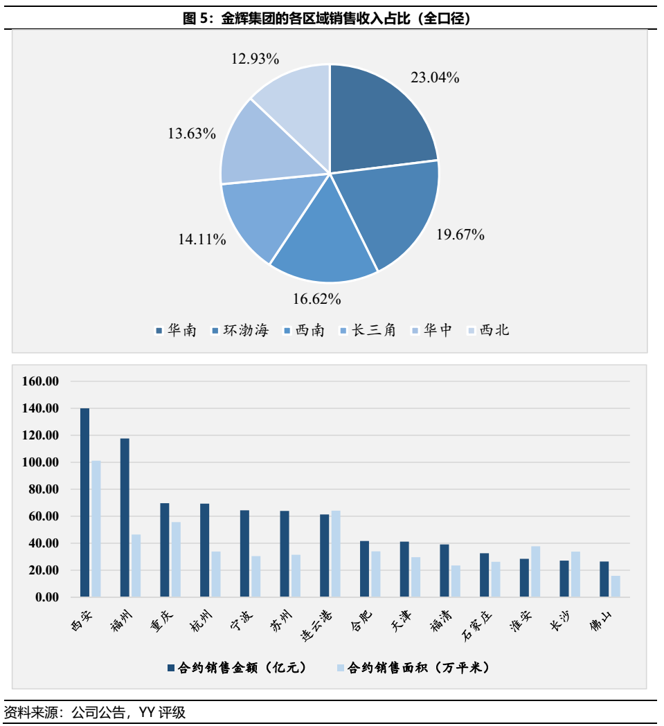 金輝集團的跨區(qū)域戰(zhàn)略布局緩慢,自96年于福州成立后至16年進駐緊鄰的灣區(qū)花了20年,其中或有02年與融僑合作致使金輝自有品牌布局較慢所致,但對于核心城市的全國化布局仍稍顯緩慢。與其他房企自一線城市串聯(lián)至二三線城市的模式不同,金輝集團早期布局上海并遷總部于北京后,其發(fā)展區(qū)域圍繞著西北、西南和東北區(qū)域,而非自一線有序下沉至二三線,此一節(jié)奏或為導(dǎo)致金輝集團的發(fā)展滯后于其他知名房企的主因。