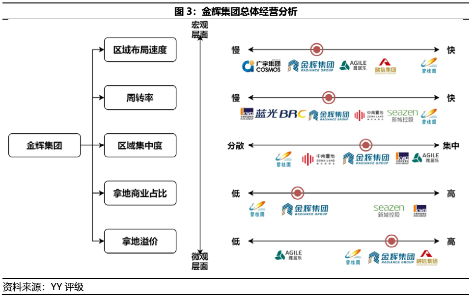 金輝集團的經(jīng)營指標包括周轉(zhuǎn)率/區(qū)域集中度/綜合拿地占比表現(xiàn)均較為中庸(如圖3),但高價/溢價拿地情形較為普遍,疊加不具備投資性物業(yè)運營優(yōu)勢,短期或面臨利潤遭壓縮的壓力,中長期亦面臨成本端上升造成的利潤擠壓。