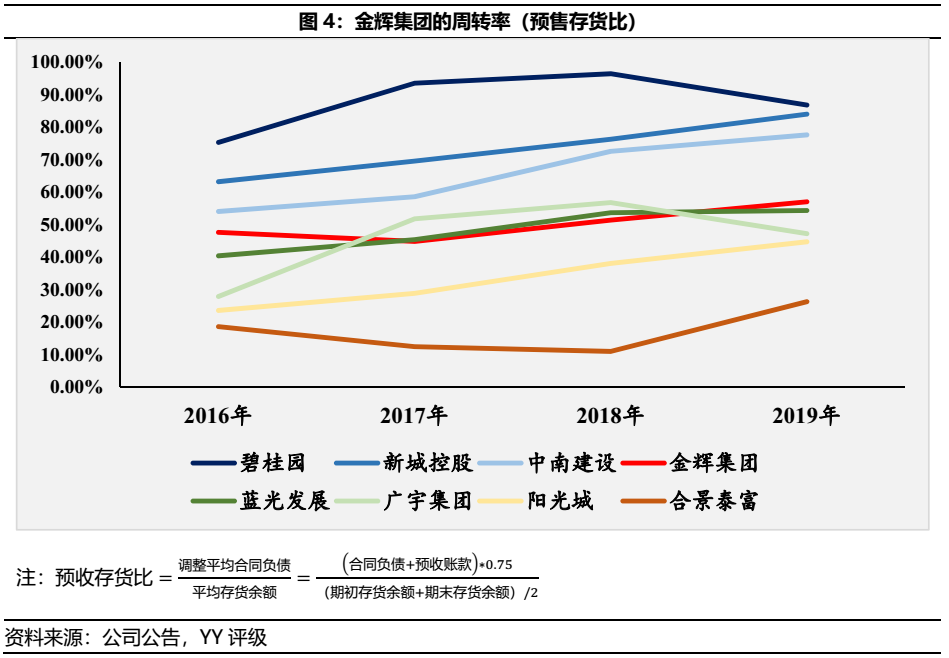 金輝集團在經(jīng)營層面周轉(zhuǎn)率指標表現(xiàn)中庸,雖無法企及碧桂園的周轉(zhuǎn)率,但仍在行業(yè)標準水平。