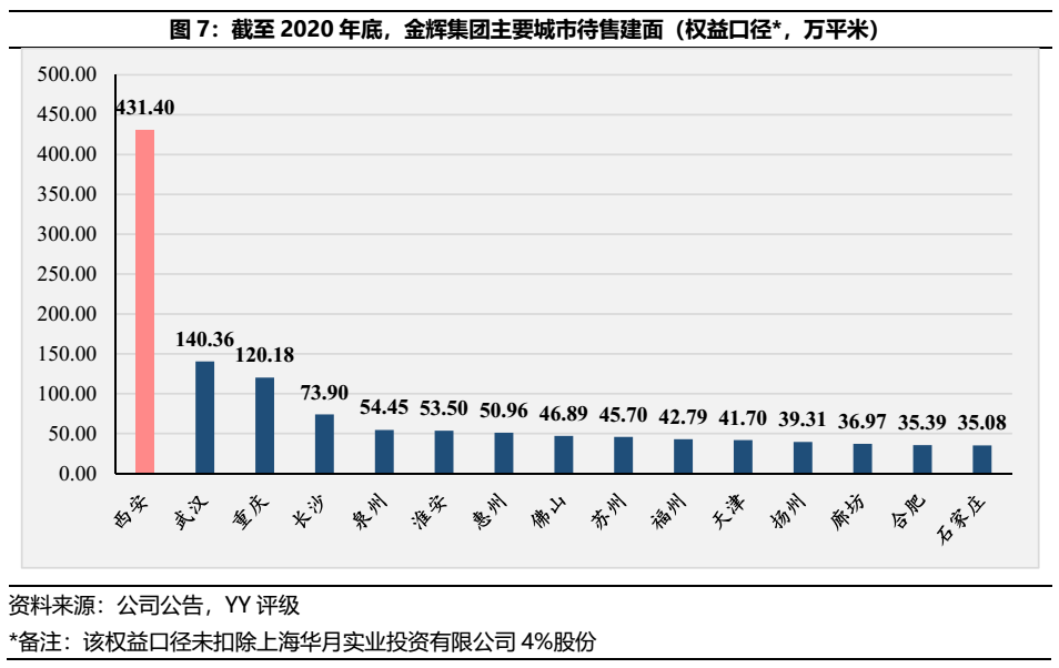 自各城市待售建面(權(quán)益口徑)統(tǒng)計可見,除了西安區(qū)域待售建面遠超于各城市,其余城市的待售建面較為平均。金輝集團的重倉西安策略或與集團為了解決土地成本問題有關(guān),除了一般的住宅和公寓產(chǎn)品外,金輝集團的西安區(qū)域業(yè)態(tài)亦存在較多的持有型物業(yè),致使截至20年末待銷售建面達431.40萬平米,約等于20多個中型樓盤。