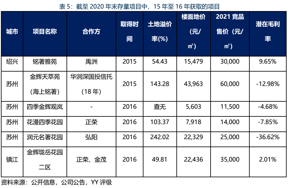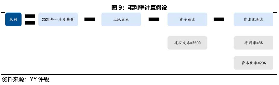利用簡要的毛利率測算(如圖9),結(jié)合2021年一季度項目/競品售價、土地獲取成本、建安成本(含銷管成本)和資本化利息等要素,對金輝集團存量儲備項目中的近5年間獲取項目進行毛利率估算。