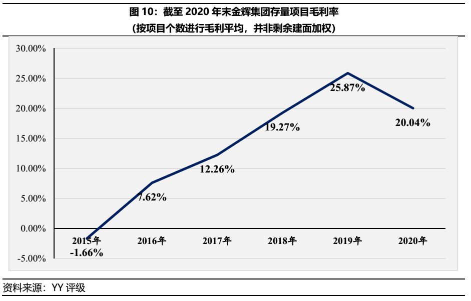 根據(jù)圖9對金輝集團截至20年末存量項目進行毛利率測算,并依照拿地時間進行排序,可發(fā)現(xiàn)自15至17年間存量項目毛利率僅為-1.66%、7.62%和12.26%,屬于第一波利潤壓縮期間,該問題始于金輝集團自身高溢價拿地造成。而20年新獲取的項目則為20.04%,將面臨第二波利潤壓縮。