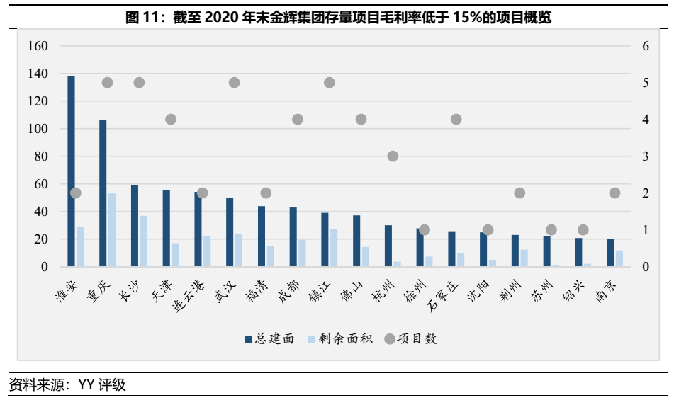 然而,根據(jù)存量項目區(qū)域分布進行分析,金輝集團所面臨的低毛利壓力或更勝于其他房企。其他房企所面臨的低毛利多出現(xiàn)于長三角核心城市,其原因來自于競爭房企過多所致的溢價。然而,金輝集團低于15%毛利率的項目分布(如圖11)多位于重慶、長沙、武漢、鎮(zhèn)江和石家莊等競爭不如長三角區(qū)域的城市,除了房住不炒造成的壓力外,金輝集團或因投研判斷偏誤而給出較高溢價所造成的因素。